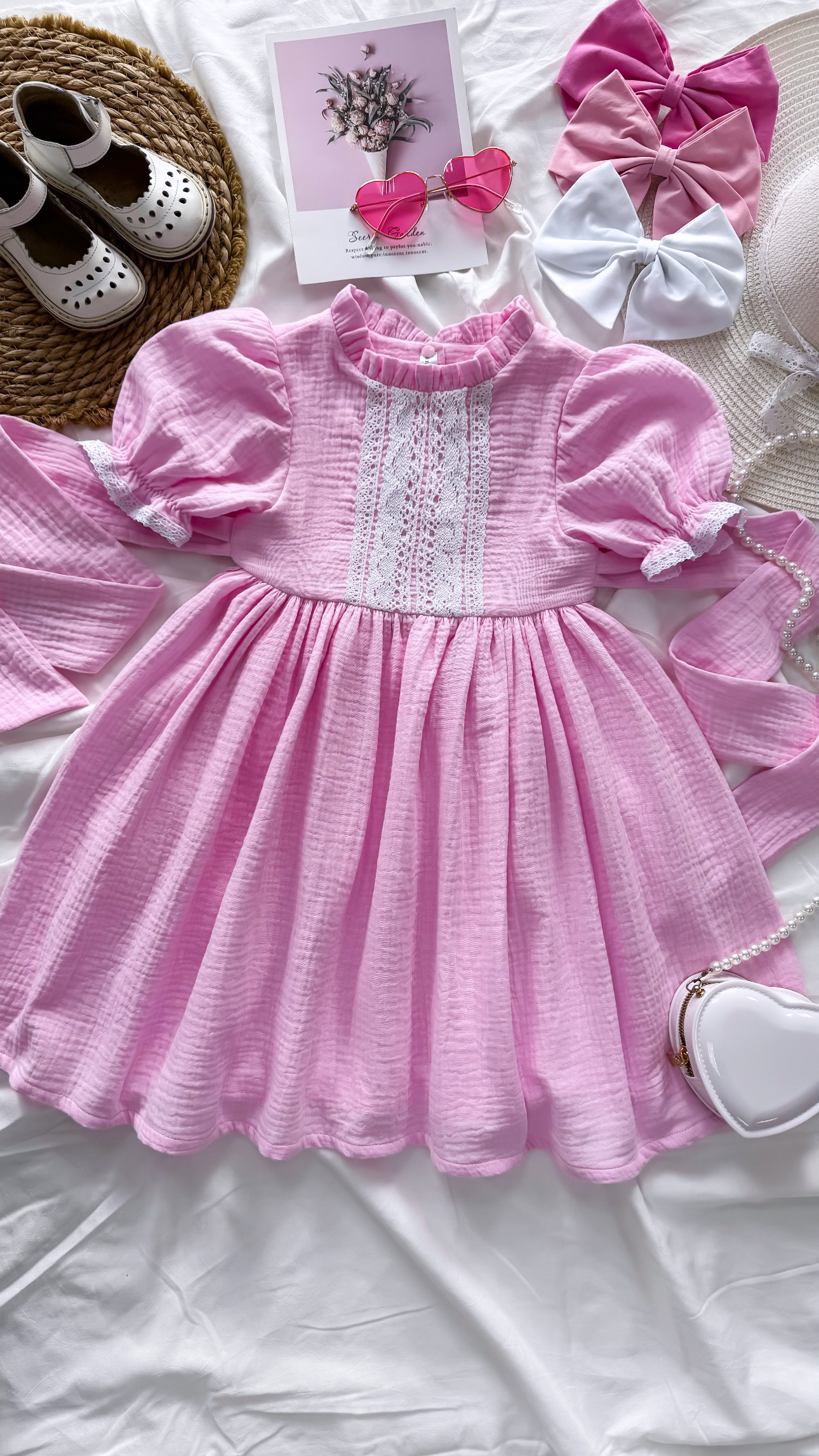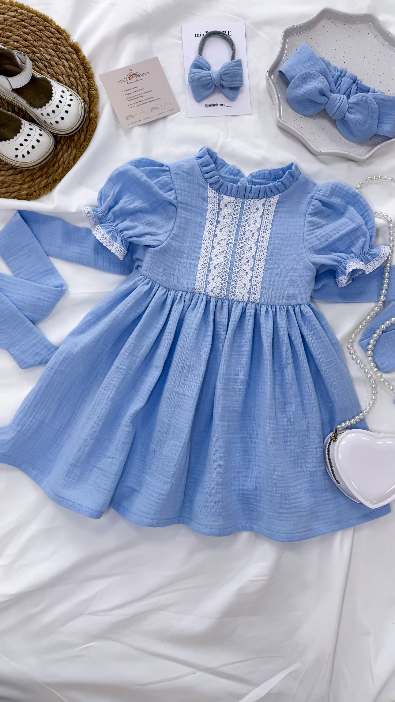 Платье из муслина с рукавами-фонариками, кокетка с мягчайшим хлопковым кружевом и наряд с поясом, завязывающимся по спинке на бант