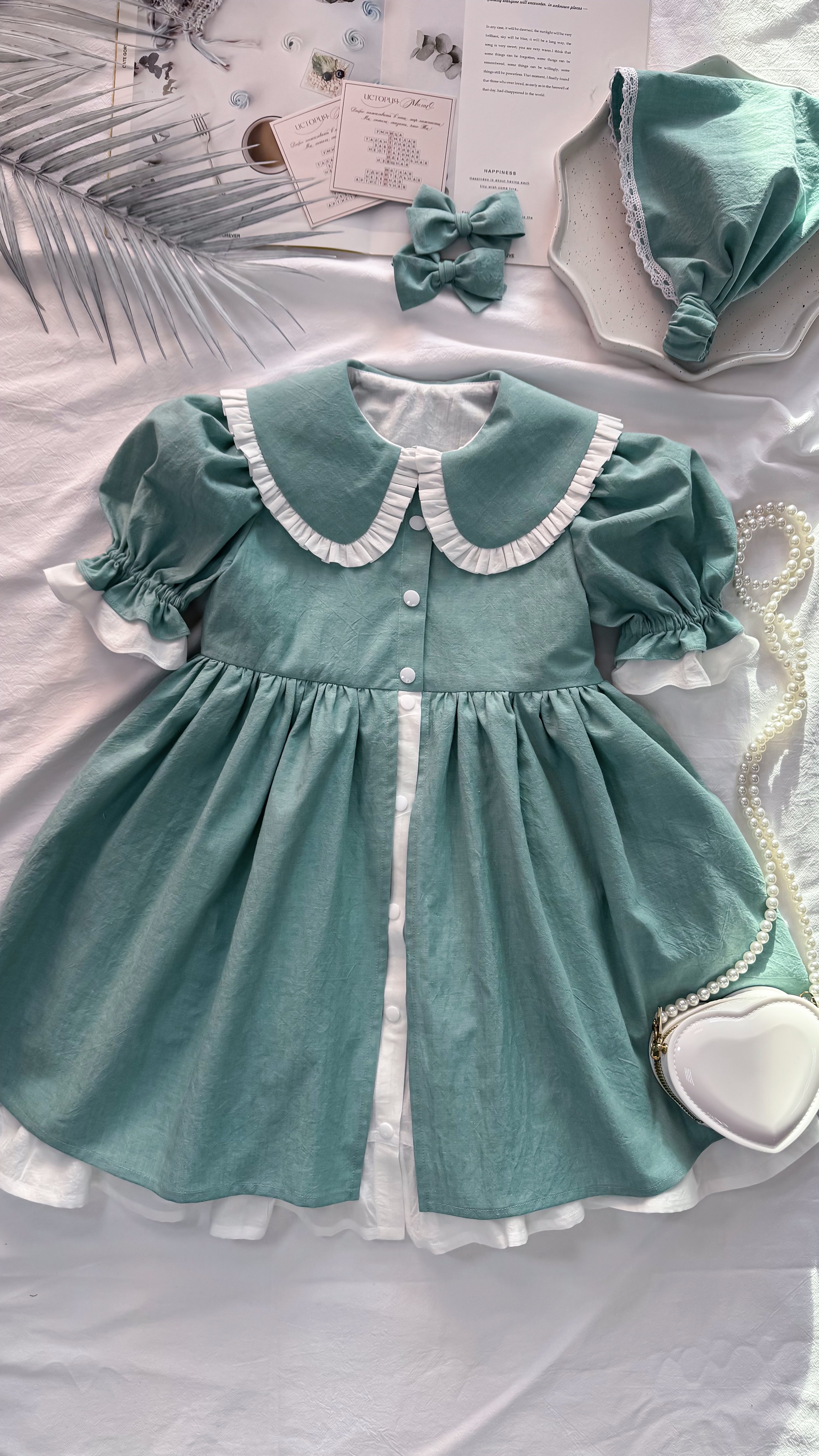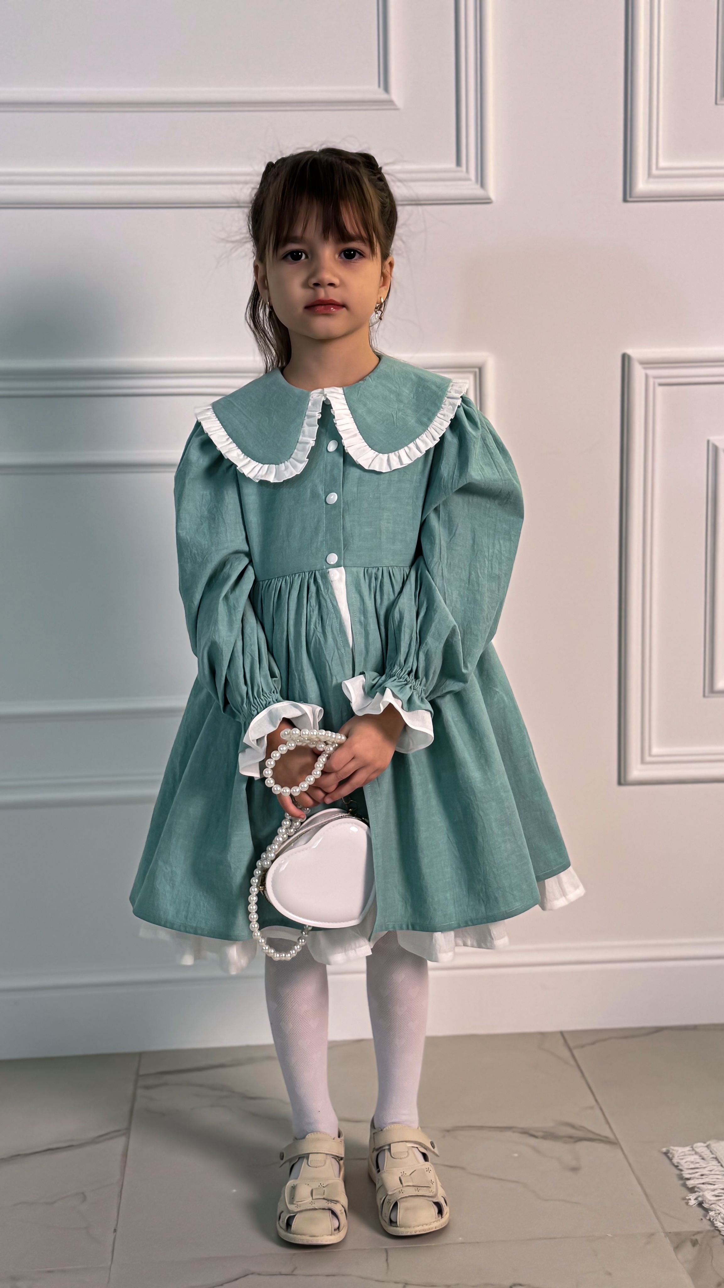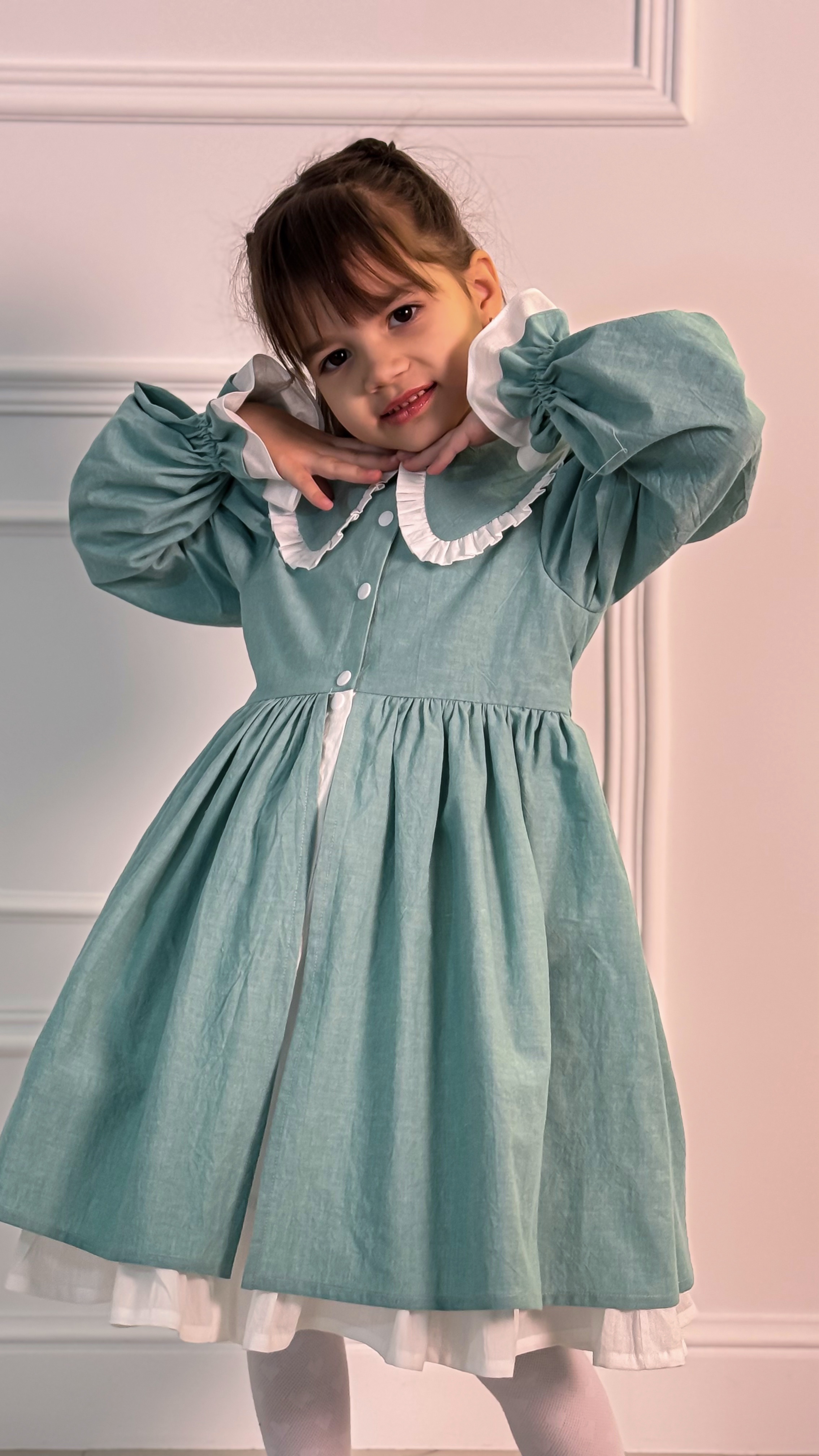 Сшито из 100% хлопка, с красивым воротником, с пышной юбкой, с батистовым подъюбником, с объемными рукавами (рукавами-фонариками или длинными рукавами на выбор), верх на хлопковой подкладке. По спинке с поясом, завязывающимся по спинке на бант.