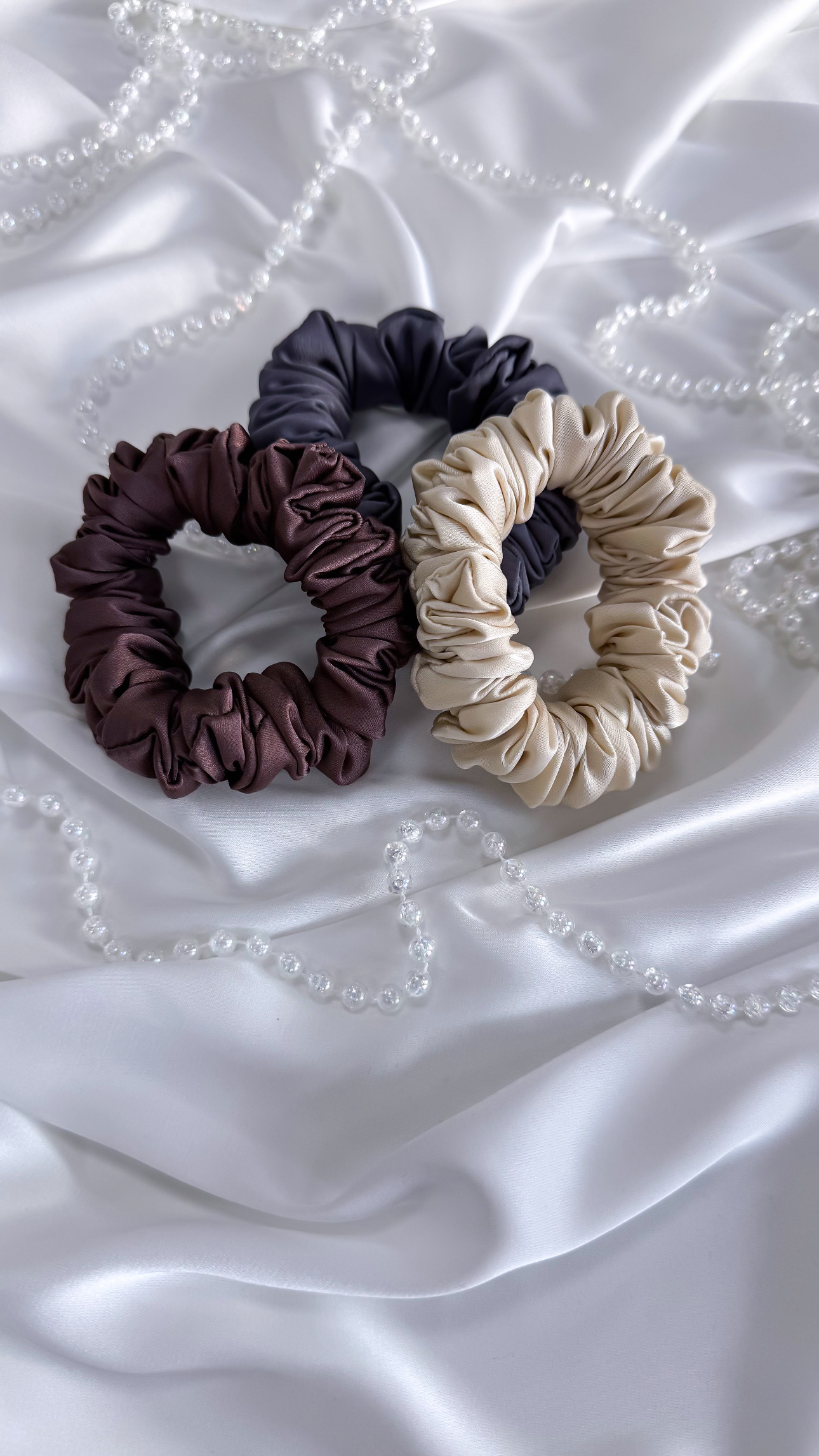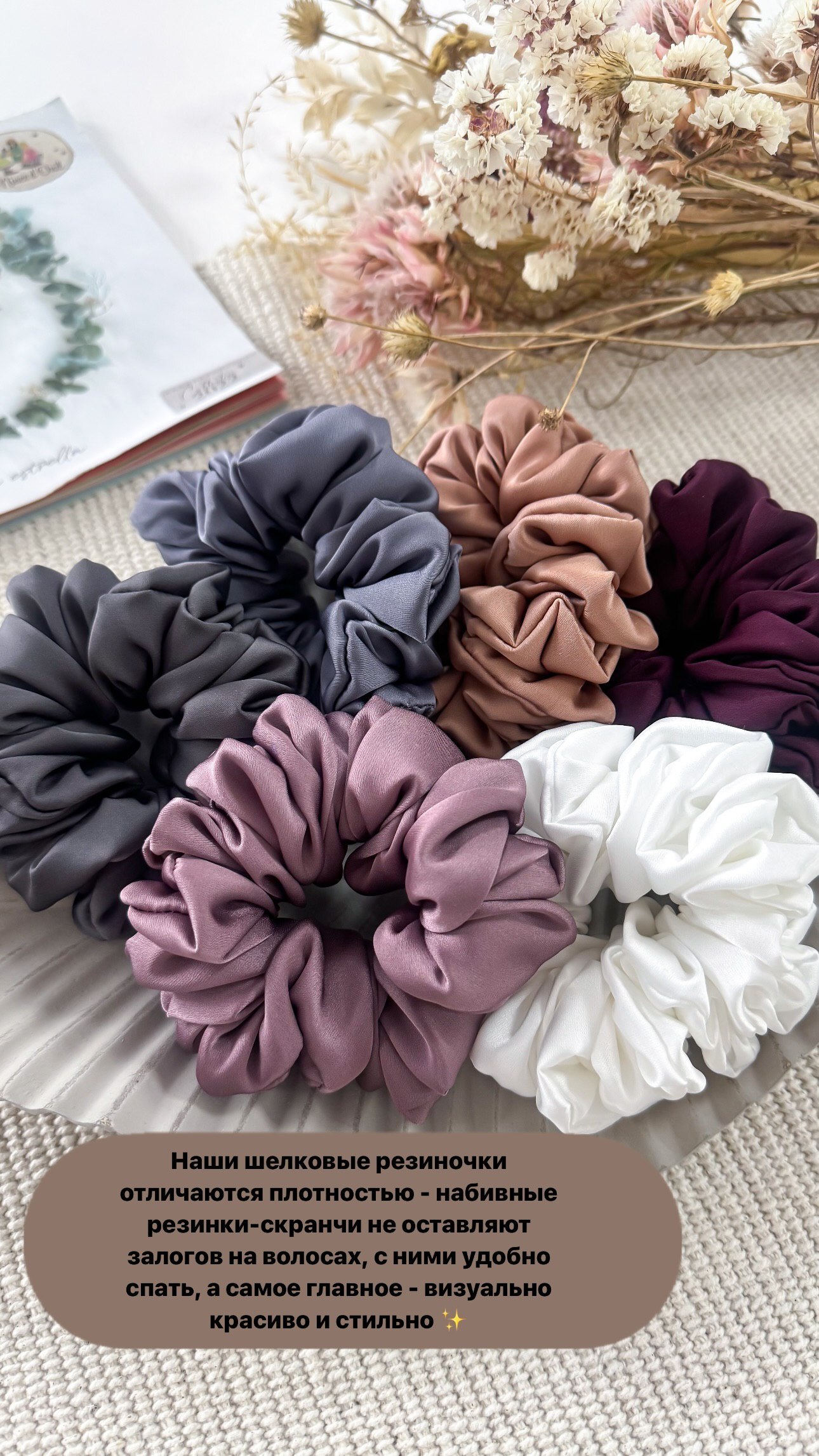 Шелковая резинка изготовленна из высококачественного шелка, мягкого и приятного на ощупь. Резинки не только бережно ухаживают за вашими волосами, предотвращая ломкость и спутывание, но и выглядят стильно и элегантно. Скранчи не оставляют заломов на волосах, сохраняя их гладкими и блестящими.